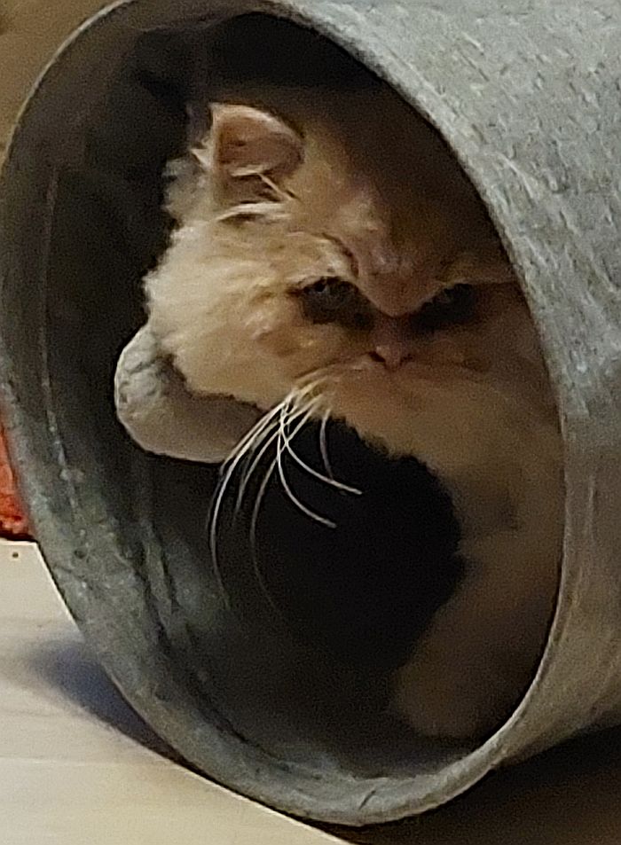 Nach kurzer Eingewöhnung ist sie eine angenehme Gesellschaft, auch als Zweitkatze geeignet, wenn die andere Katze ebenso gelassen ist. Vor einem zu aufdringlichen Fellpartner flüchtet sie. Dazu lesen Sie bitte die Infos zur „Zusammenführung von Katzen“