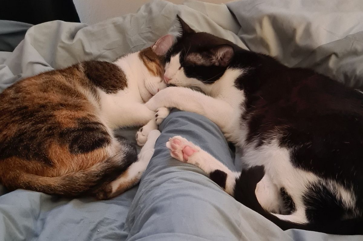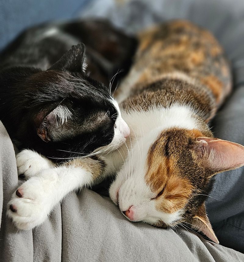 Die beiden sind an Berufstätigkeit gewöhnt, an normalen Arbeitstagen waren sie etwa neun Stunden allein und haben den ganzen Tag mit einander gekuschelt. Danach suchen sie viel Nähe, Aufmerksamkeit und Kuscheleinheiten von ihren Menschen.