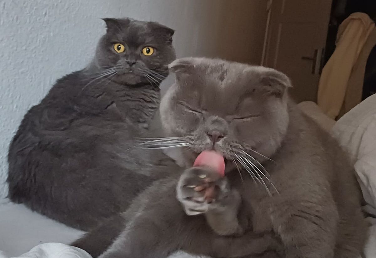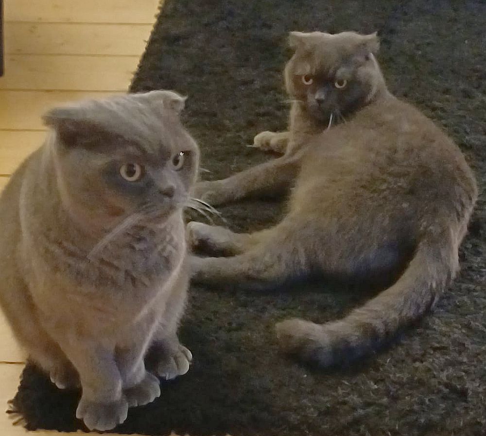 Gemeinsam haben wir mit 4 anderen Scottish Fold Katzen und einem Hund zusammen gelebt, jedoch mussten wir dort ausziehen. Nun sind wir zu zweit bei unserer Pflegestelle und haben hier schon viele Herzen erobern können.