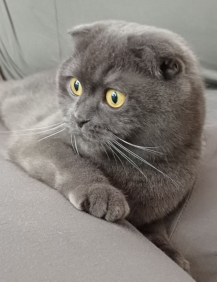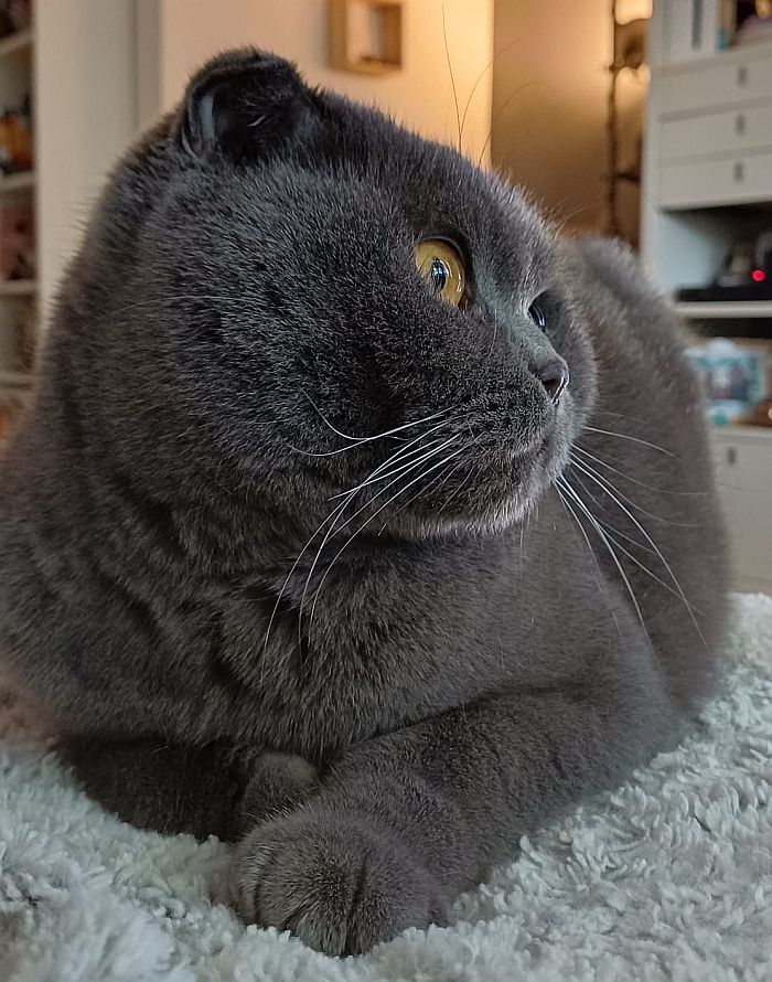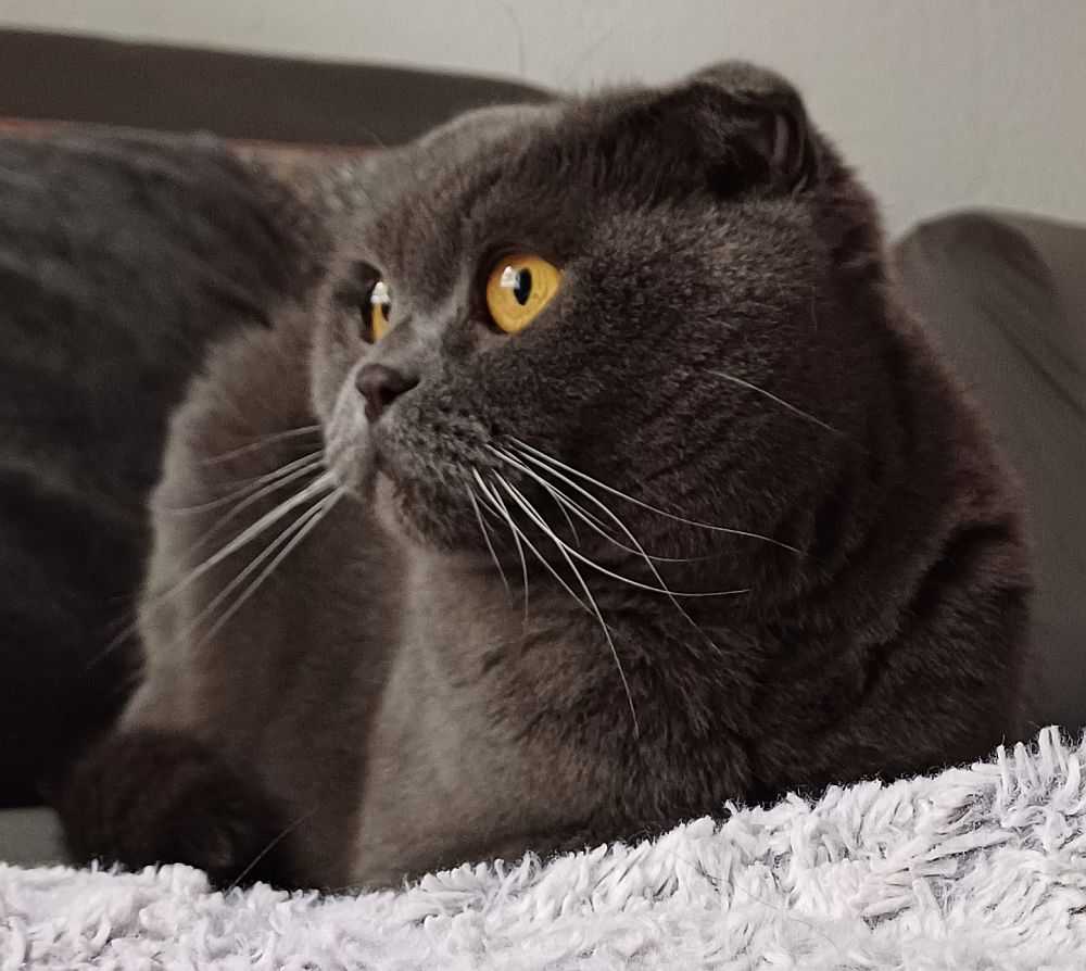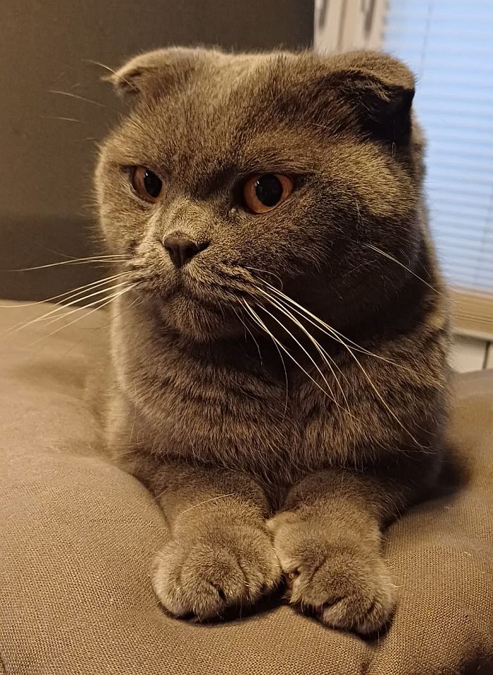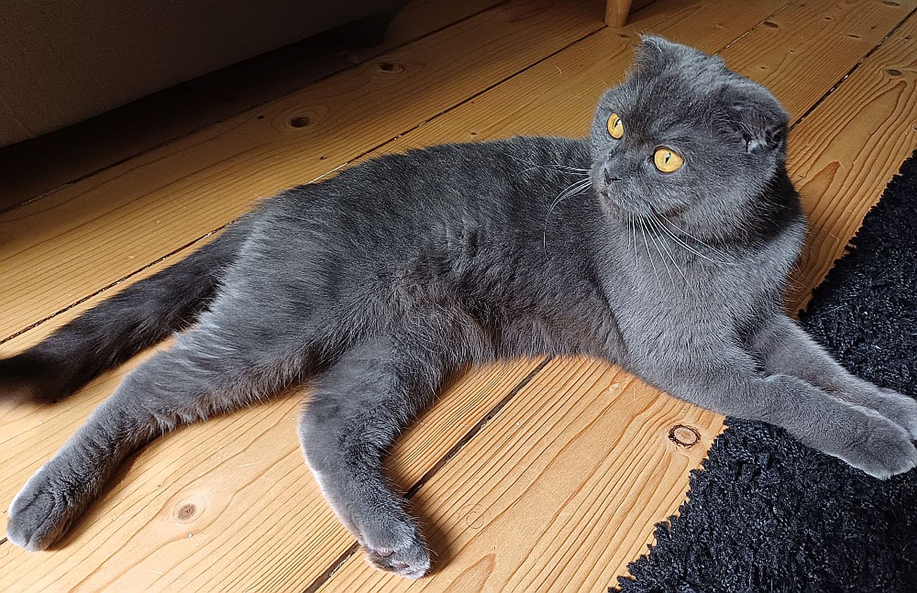 Ich bin Mungo, der Kater, der einen kürzeren Schwanz hat und ein wenig gedrungen im Körperbau ist. Ich habe leider von uns beiden die typischeren und ausgeprägteren Beschwerden einer Scottish Fold Katze. Meine Gelenke sind steifer als bei meiner Schwester und mein Gang ist etwas schwerfälliger. Meine Hüfte ist insgesamt sehr unbeweglich und ich sitze oft auf dem Po, um alles zu entlasten (das sieht für Menschen sehr amüsant aus, ist aber für mich die einzige Möglichkeit, mir ein wenig Linderung zu verschaffen). Meine Pfoten sind stark geschwollen und dick, daher mag ich es überhaupt nicht, wenn man mich dort berührt.