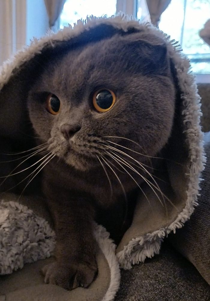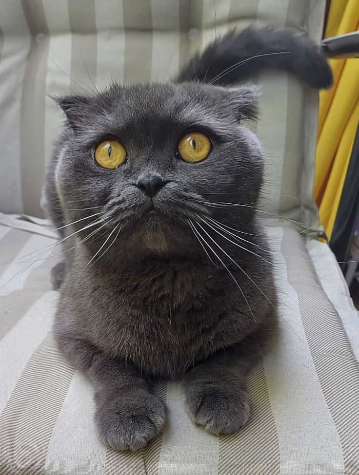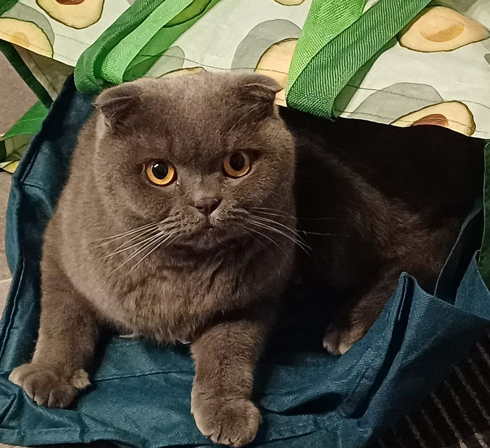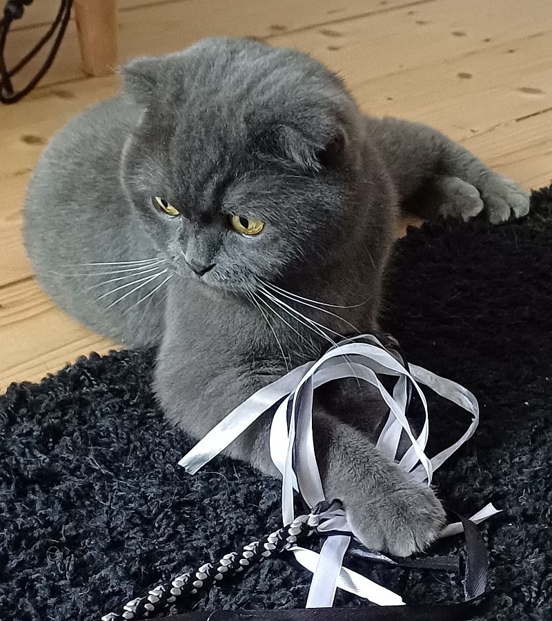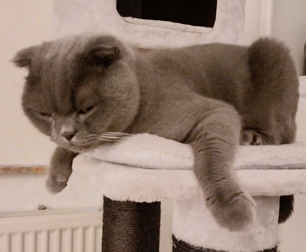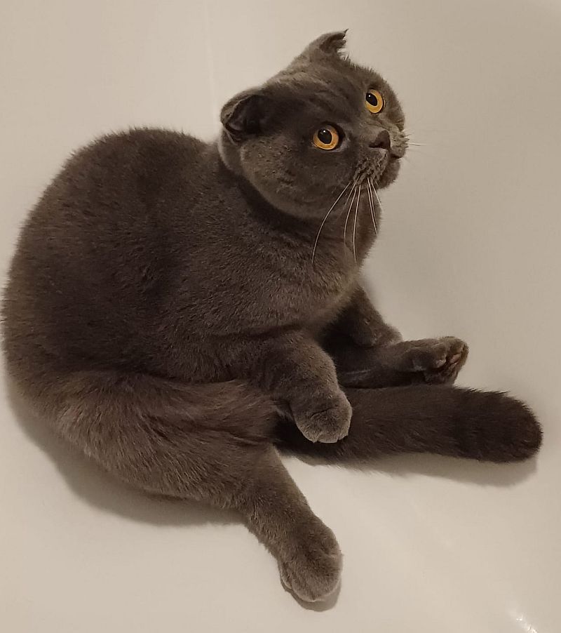 Ich bin Mungo, der Kater, der einen kürzeren Schwanz hat und ein wenig gedrungen im Körperbau ist. Ich habe leider von uns beiden die typischeren und ausgeprägteren Beschwerden einer Scottish Fold Katze. Meine Gelenke sind steifer als bei meiner Schwester und mein Gang ist etwas schwerfälliger. Meine Hüfte ist insgesamt sehr unbeweglich und ich sitze oft auf dem Po, um alles zu entlasten (das sieht für Menschen sehr amüsant aus, ist aber für mich die einzige Möglichkeit, mir ein wenig Linderung zu verschaffen). Meine Pfoten sind stark geschwollen und dick, daher mag ich es überhaupt nicht, wenn man mich dort berührt.
