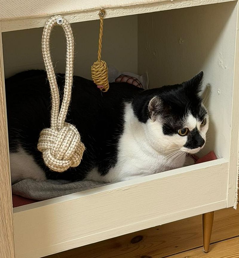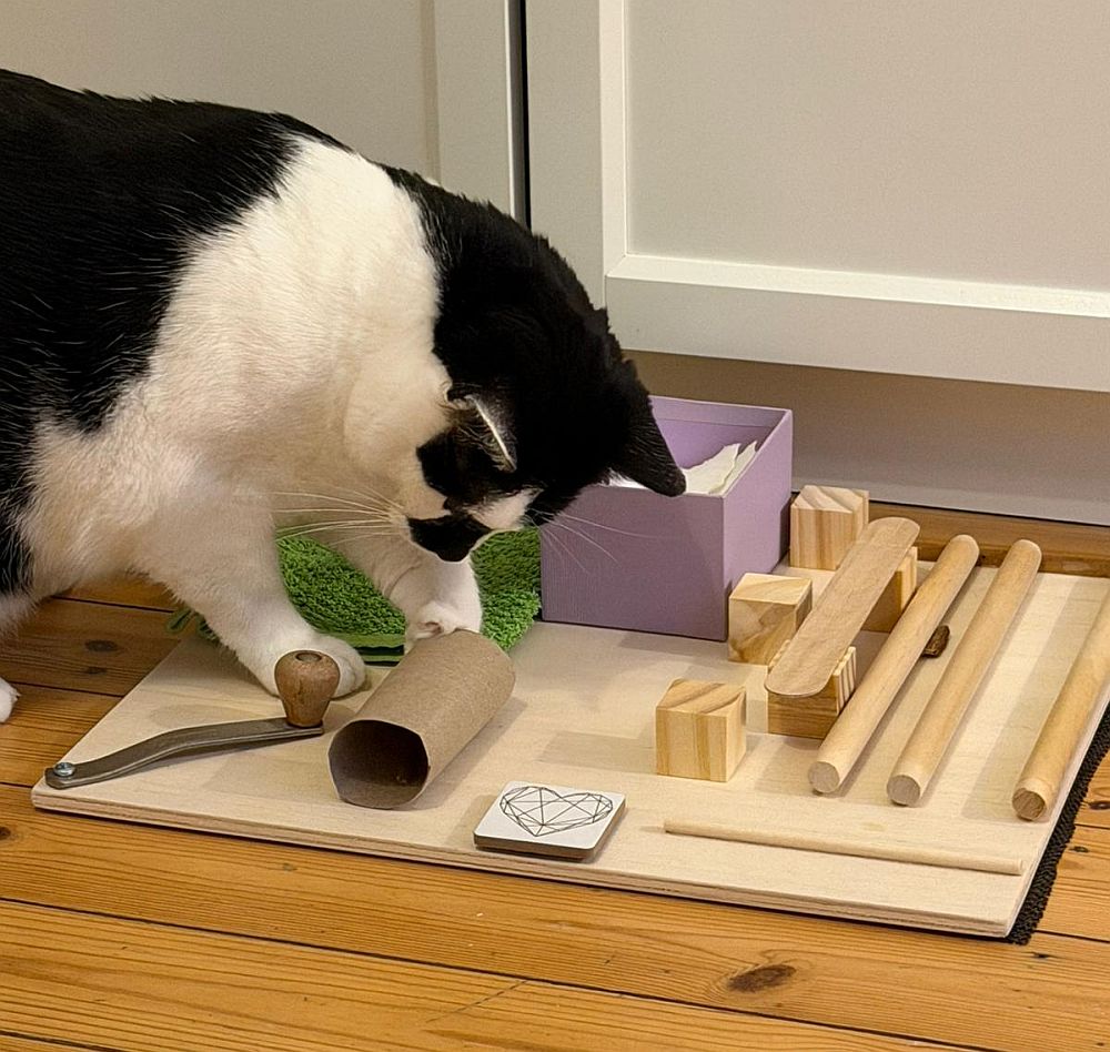 Sie mag ihre Spieleinheiten, lernt schnell und ist eine wunderbare, unaufdringliche und geduldige Mitbewohnerin. Am liebsten jagt sie ihrem Seil hinterher oder sucht Leckerli auf ihrem Fummelbrett.